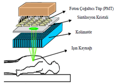 The gamma camera device is a kind of normal camera. It creates an image by detecting gamma rays instead of visible rays reflected from objects. The beam source is the patient body, not the device. Before the imaging procedure at the patient's home, the area to be imaged is used as a special radiopharmaceutical. Technetium-99m, on the other hand, has a half-life of 6 and is the most widely used radioisotope in the Nuclear Medicine imaging department with its 140 keV gamma device.